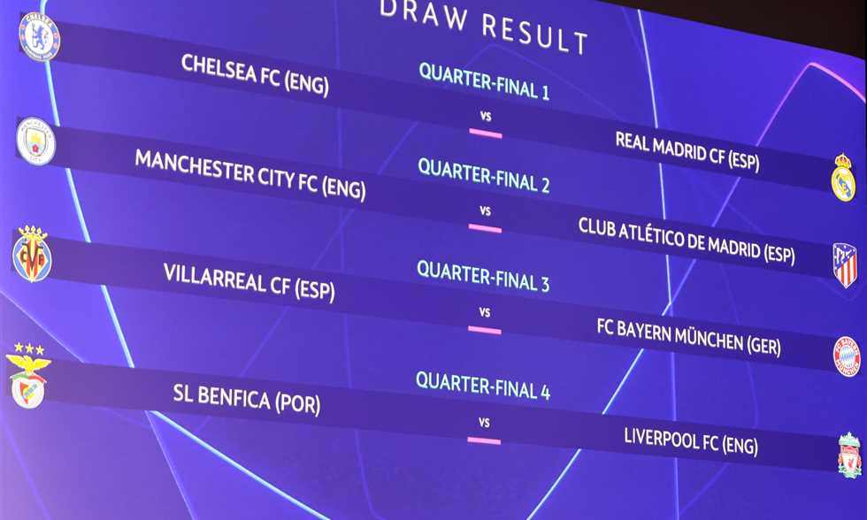 ويلعب الفائز من ليفربول وبنفيكا في نصف النهائي مع المتأهل من لقاء بايرن ميونيخ أمام فياريال، بينما سيلعب في نصف النهائي الآخر الفائز من تشيلسي وريال مدريد مع المتأهل من مانشستر سيتي وأتلتيكو مدريد.